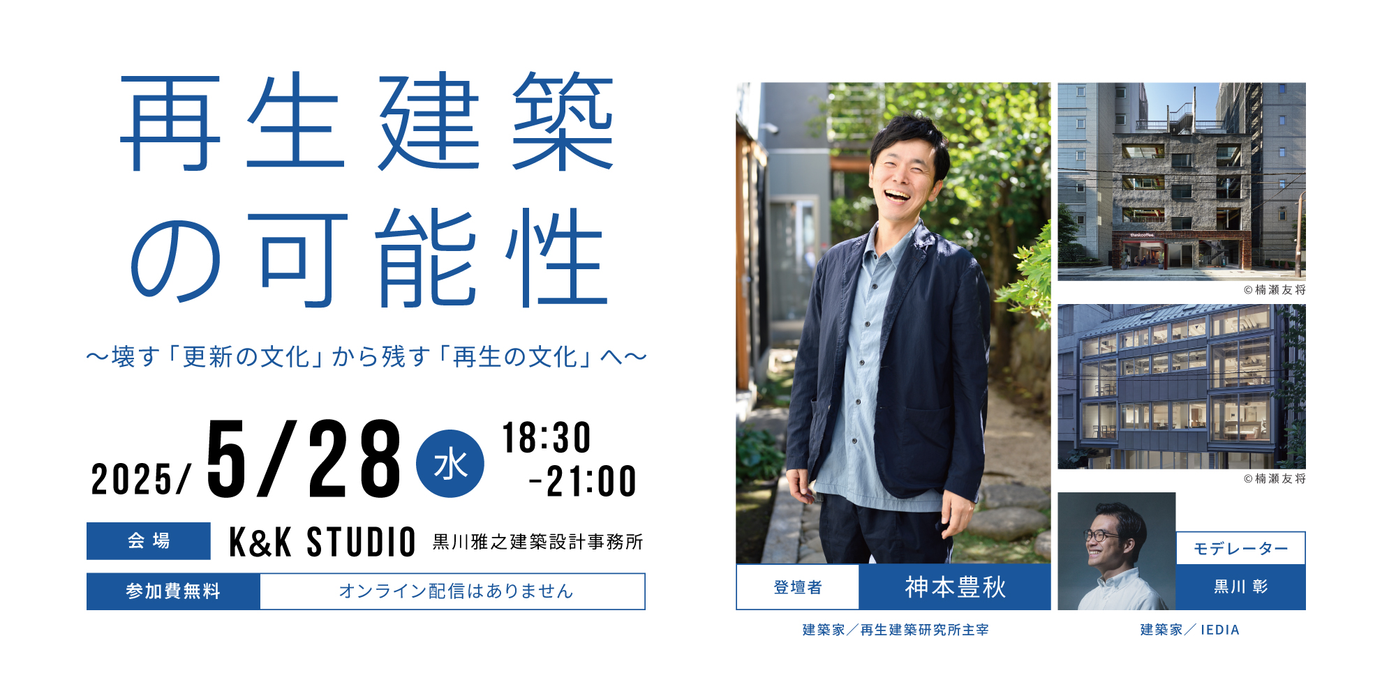 今回のトークイベントでは、再生建築の第一人者である神本豊秋さんが登壇。これまで彼が手掛けてきた数々の再生プロジェクトを通じて、「壊すことが前提」だった建築のあり方を見直し、限られた資源を活かしながら、価値を再発見する方法について深掘りしていきます。